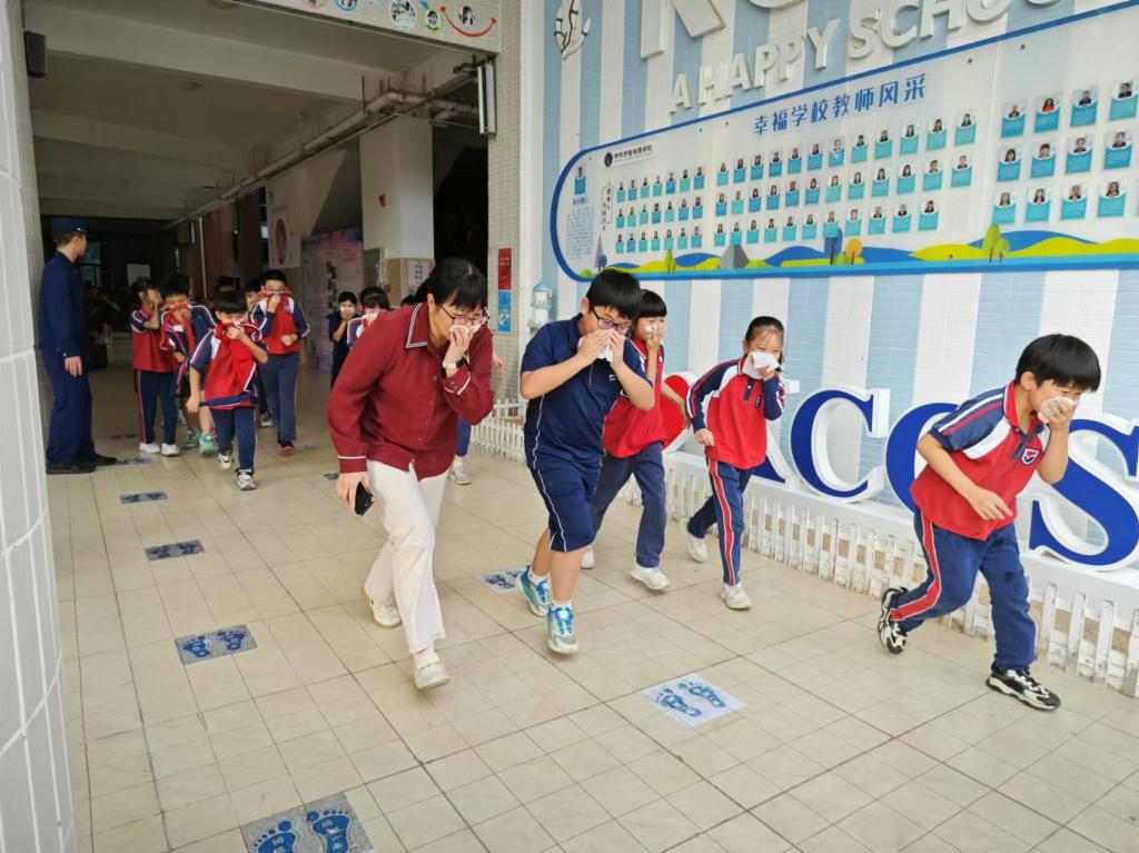 下午16时05分,随着警报声的响起,老师们迅速组织学生疏散。各班学生在老师们的指挥下,用手帕、湿毛巾等捂住口鼻,弯着腰,沿着学校指定路线快速前进,有序撒离到学校操场的安全地带,整个逃生过程仅耗时2分18秒。随后各班班主任清点人数,全校师生全部安全疏散完毕。