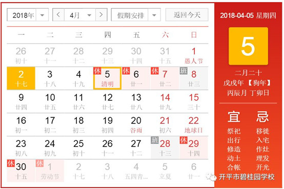 2018年4月5日至7日放假,共3天。4月8日(星期日)上课,学生穿绿色校服。