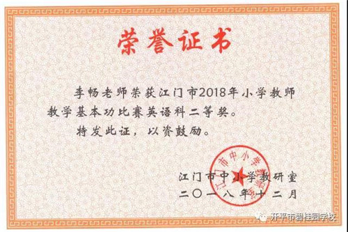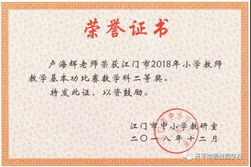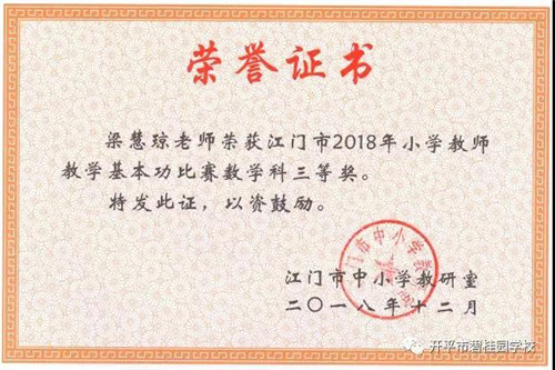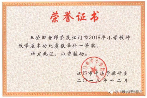为了更好地推动教师专业发展,激励教师努力提高教学基本功和专业水平,全面展示教师基本功,江门市教育局于2018年10月中旬举办了2018年江门市小学数学和英语教学基本功比赛。我校数学组王登田老师荣获一等奖、卢海辉老师荣获二等奖、梁慧琼老师荣获三等奖;英语组李畅老师荣获二等奖。