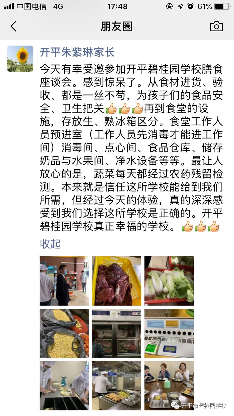 有的家长感动得热泪盈眶,动情地说:“学校从食材进货、验收,都是一丝不苟,为孩子们的食品安全严格把关……最让人放心的是蔬菜每天都经过农药残留检测。经家长们的亲眼所见、亲口品尝,真的深深感受到我们选择这所学校是正确的。开平市碧桂园学校是真正幸福的学校!”