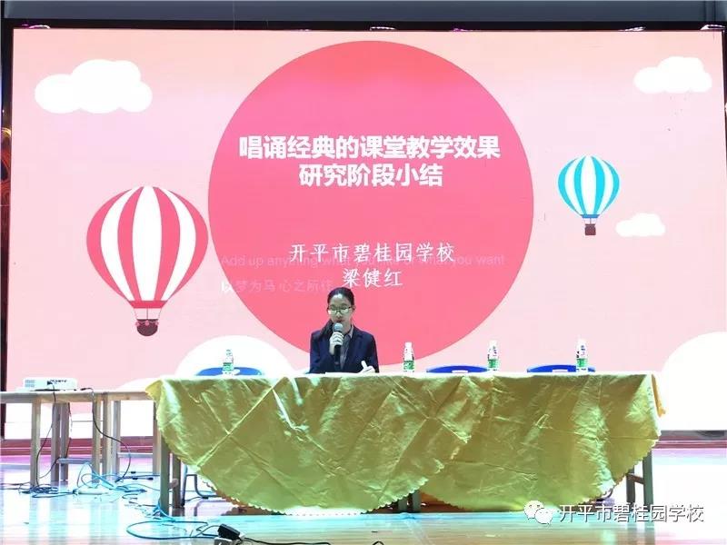 唱诵课例展示结束后,22位子课题代表先后对前期课题研究的成果做了小结。我校课题组成员梁健红老师分享了我校子课题《唱诵经典的课堂教学效果研究》取得的阶段性成果,受到了大家的一致好评。