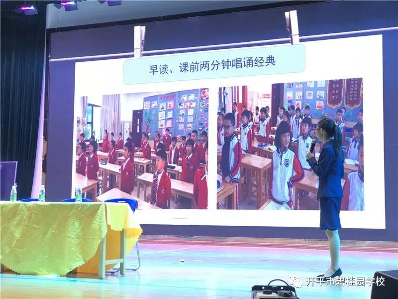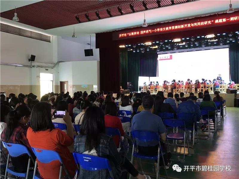 11月22日下午,开平市中小学教研室组织开展了“以歌和诗 因声求气——小学诗文教学资源创新开发与利用的研究”课题第一期研讨会,我校在综合馆承办了本次活动。现场高朋满座,胜友如云,市内各中小学校近一百二十名教师雅会于此,共享这灵性的声音,追寻唱诵之美。
