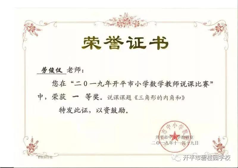 喜报——热烈祝贺我校劳俊仪老师荣获2019年开平市小学数学教师说课比赛一等奖