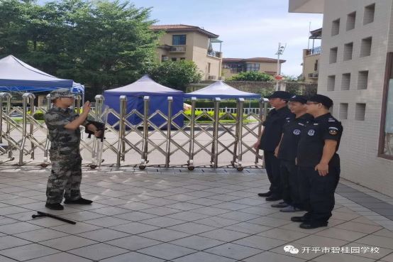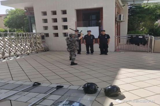 总务处吴锦伦主任组织保安检查学校防暴工具器材是否完备,训练他们如何将暴徒制服。我校法制副校长关坚明警官与梁新源警官一同到校对保安进行细致指导。