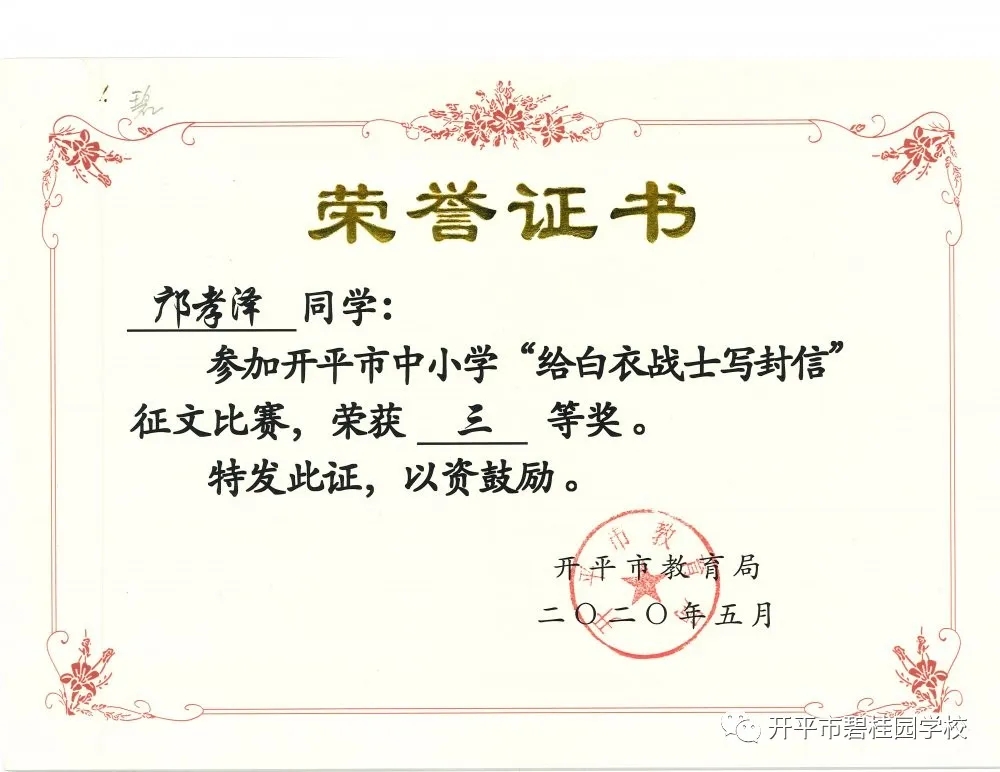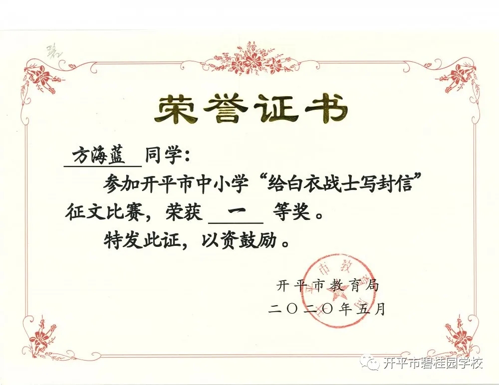 为致敬战“疫”英雄,弘扬奉献精神,营造尊医重卫良好风尚,开平市教育局开展了“给白衣战士写封信”主题征文活动,开碧学子积极撰稿,踊跃参赛。五(1)班方海蓝同学和六(1)邝孝泽同学从众多选手中脱颖而出,分别获一等奖和三等奖!感谢夏娟副校长和熊易清主任的精心辅导。