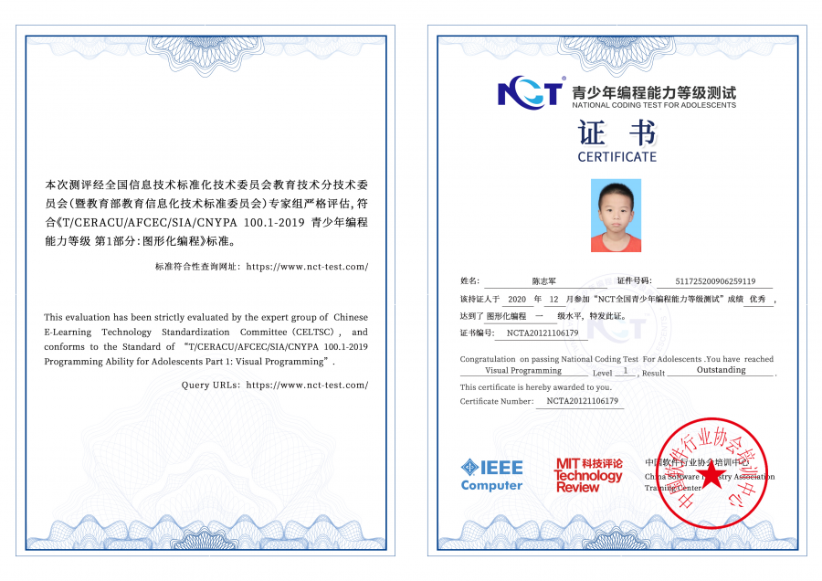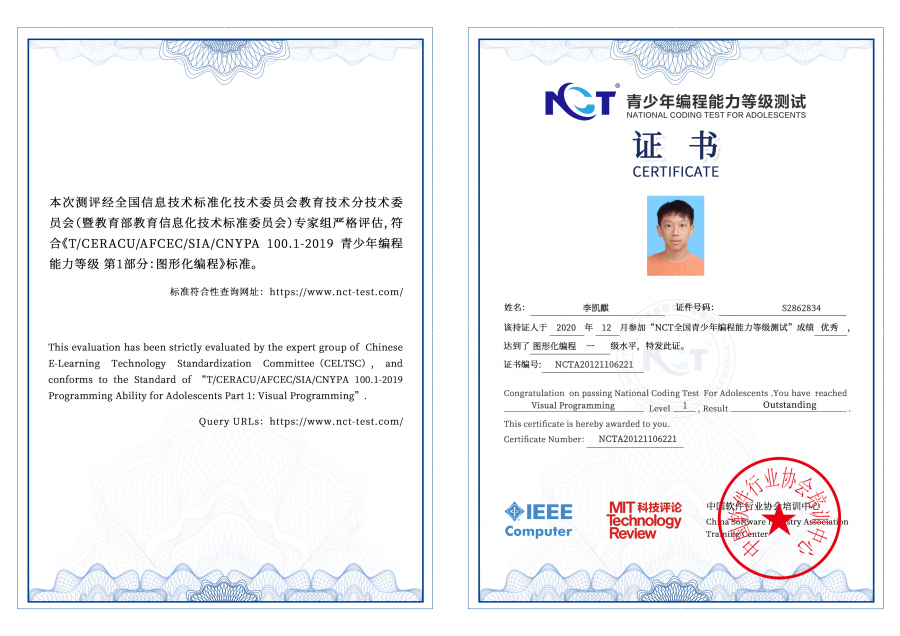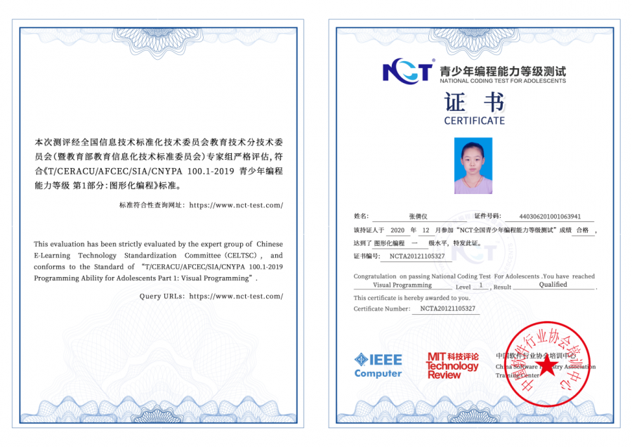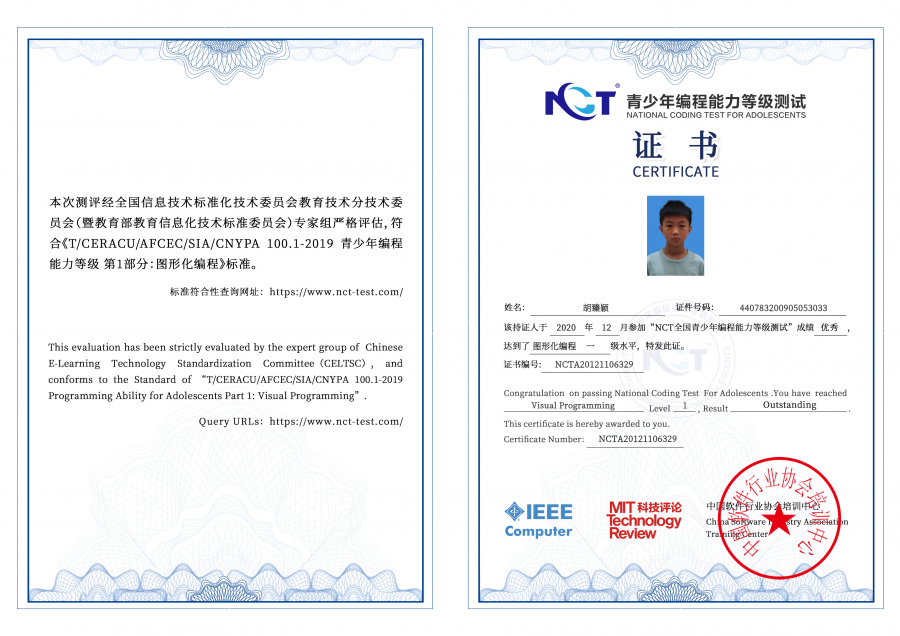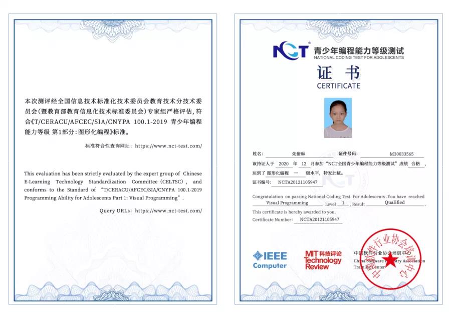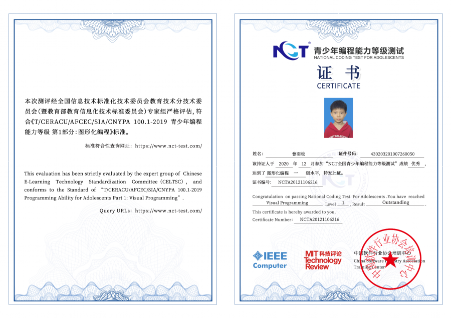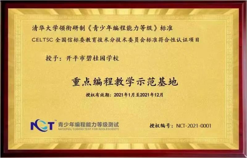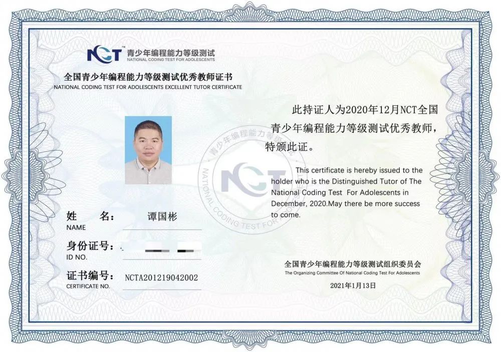 我校被NCT全国组委会授予——NCT全国青少年编程等级测试《重点编程教学示范基地》,谭国彬老师被评为全国青少年编程能力等级测试优秀教师。