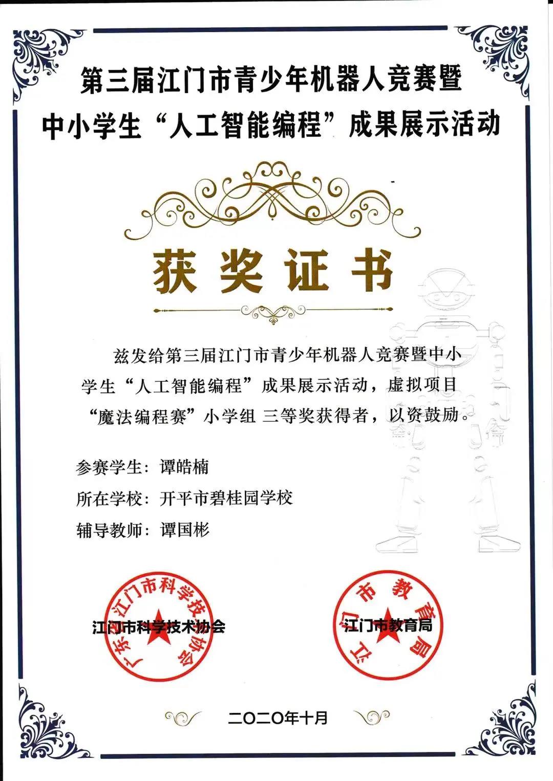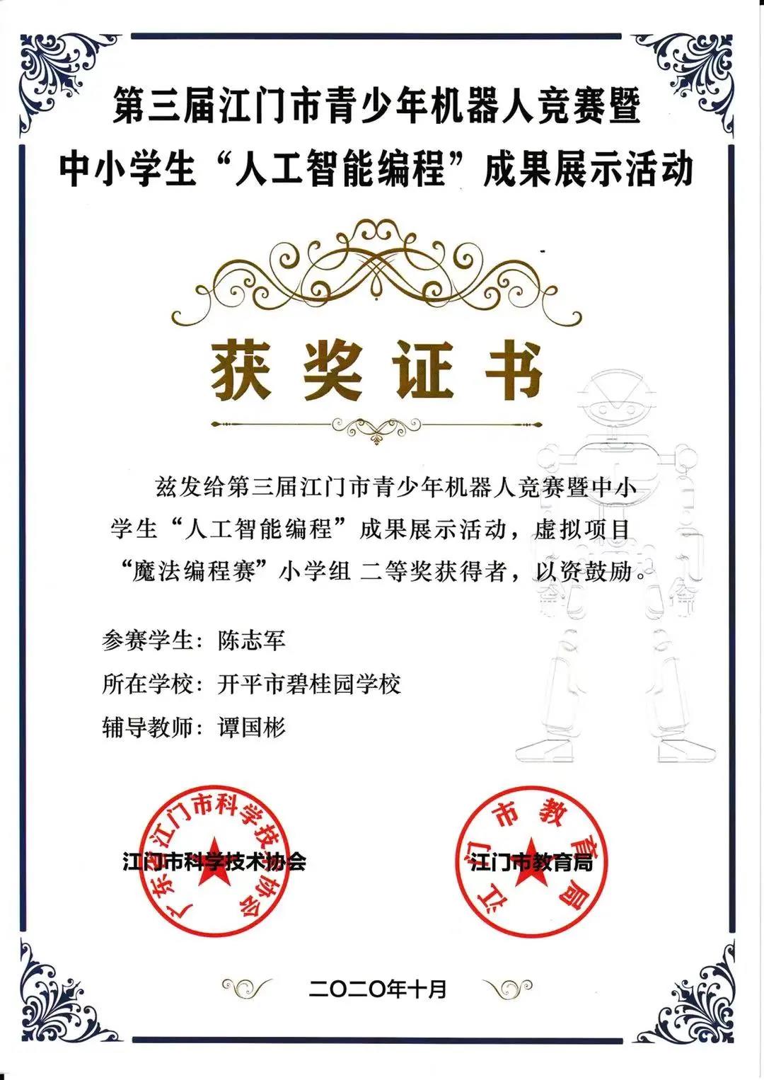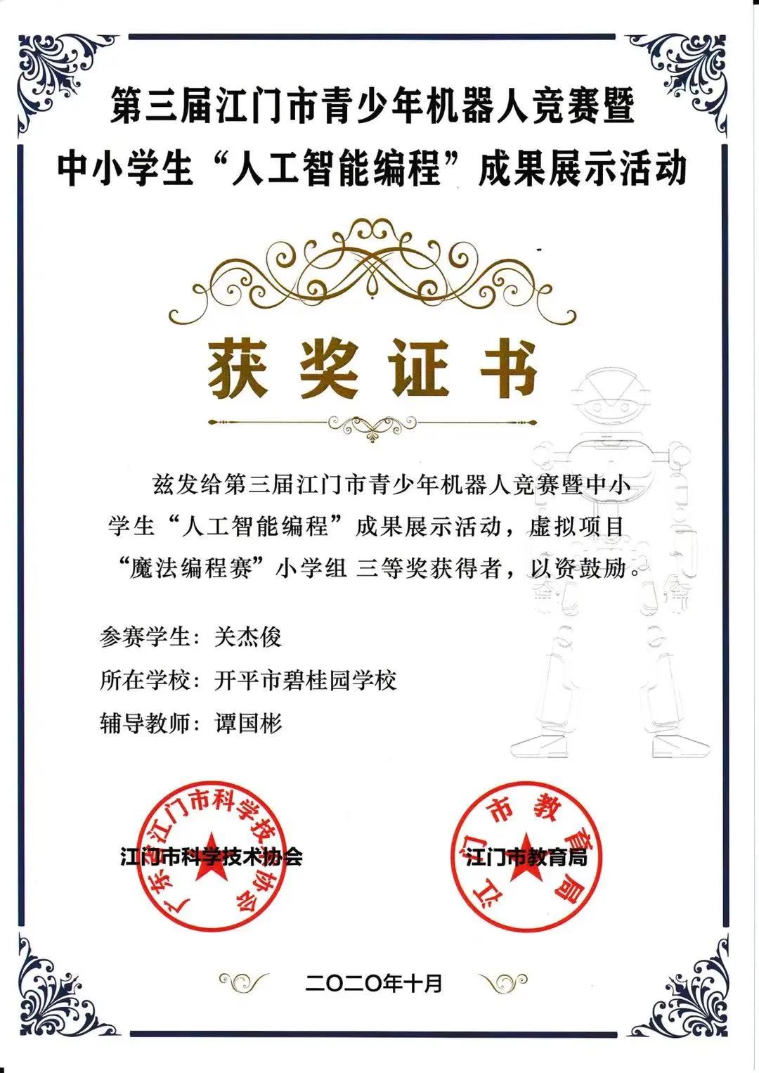 我校在CAS课程上开设的趣味编程社团课,和谭国彬老师带领的编程专业队在第二届江门市青少年机器人(编程)比赛中,多名学生荣获江门市的一、二,三等奖。