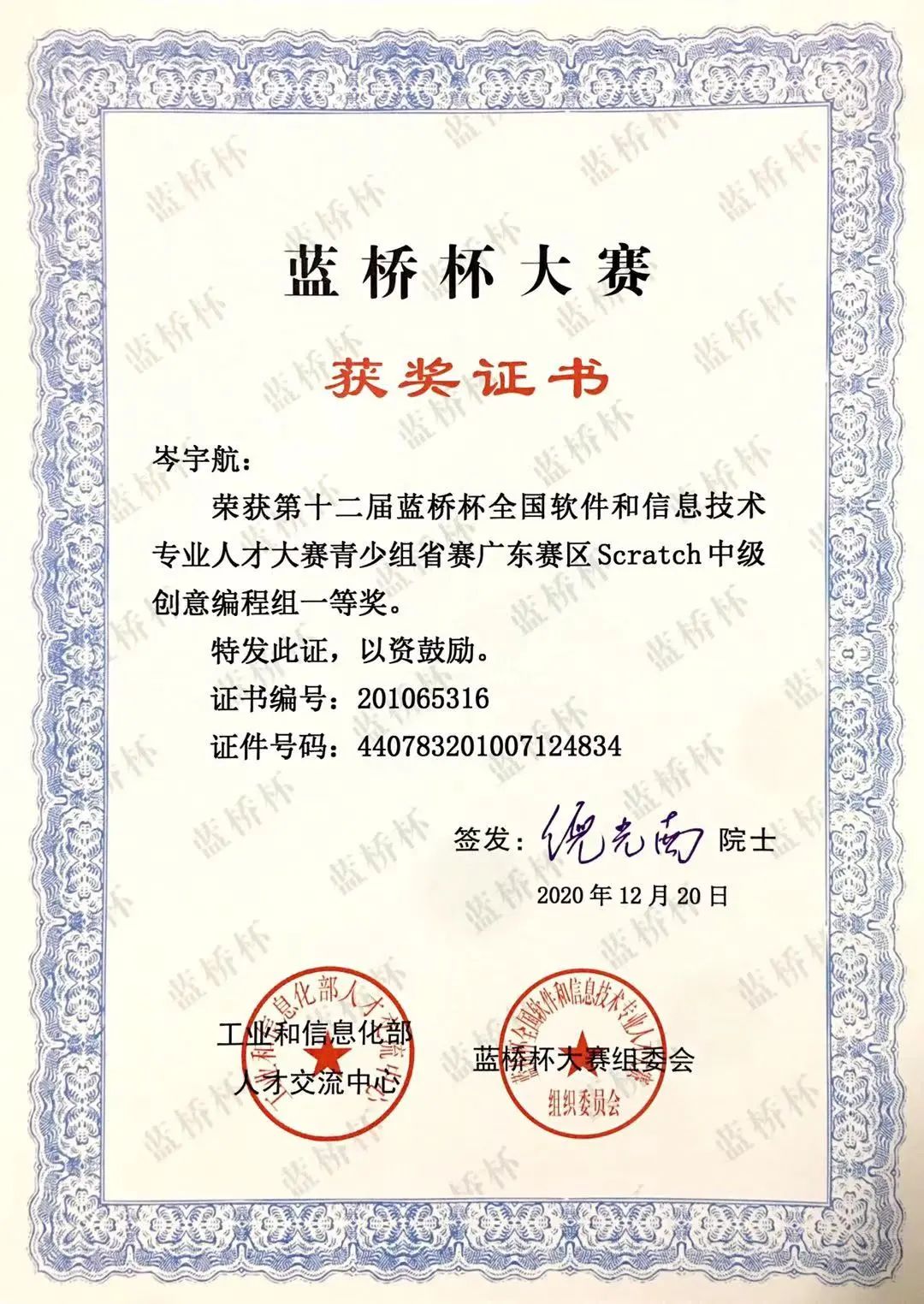 我校岑宇航同学参加第十二届蓝桥杯全国软件和信息技术专业人才大赛青少组省赛广东赛区Scratch中级创意编程组荣获一等奖。