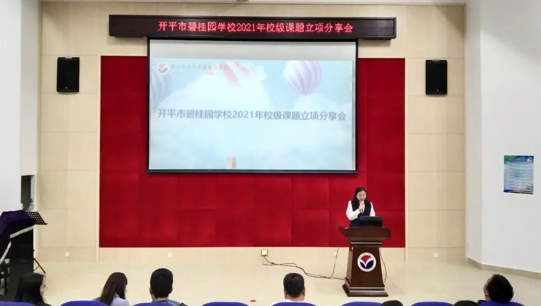 开平市碧桂园学校从建校之初就将 “科研兴校” 作为学校长期发展的重要战略之一,学校一直在努力实现课题研究工作在数量上的突破、从质量上的提升的质态。学校教科处在2021年1月组织和指导教师进行了首届校本课题的申报工作,老师们稳步开展教学改革的探索,以创新精神和实践能力为课题研究的着力点。为了给这些锐意探索的老师搭建一个展示教育智慧的平台,3月15日晚,开平市碧桂园学校2021年首届校级课题立项分享会在学术报告厅举行,会议由夏娟副校长主持,全体教师参加了本次分享会。