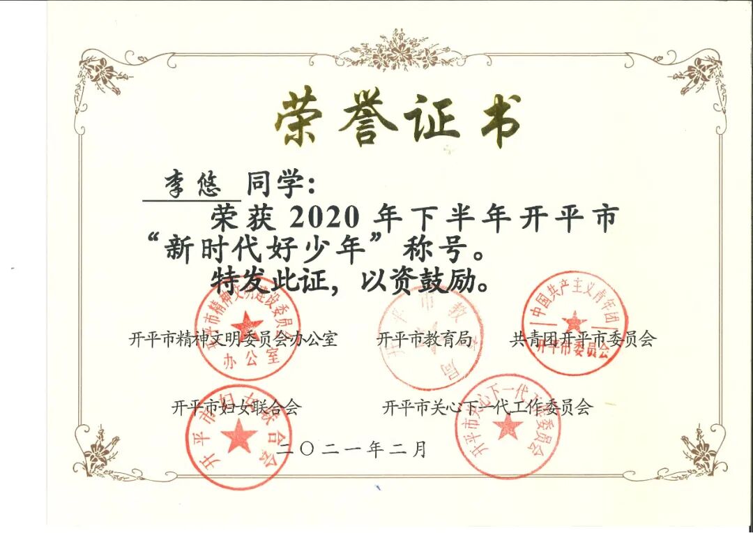 喜报——我校李悠同学被评为2020年下半年开平市“新时代好少年”