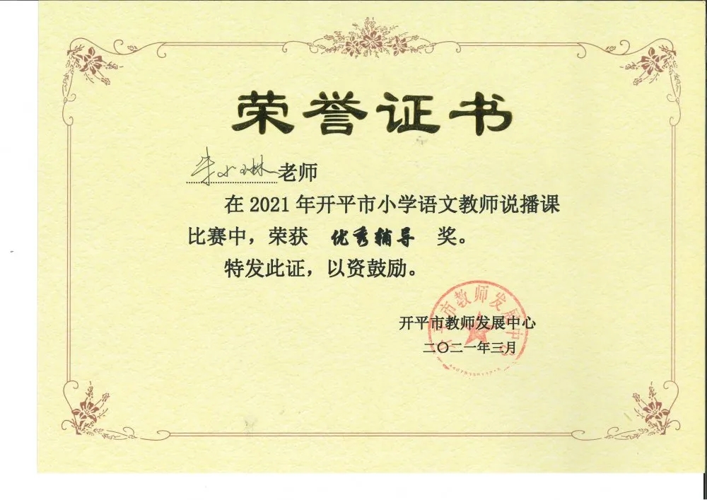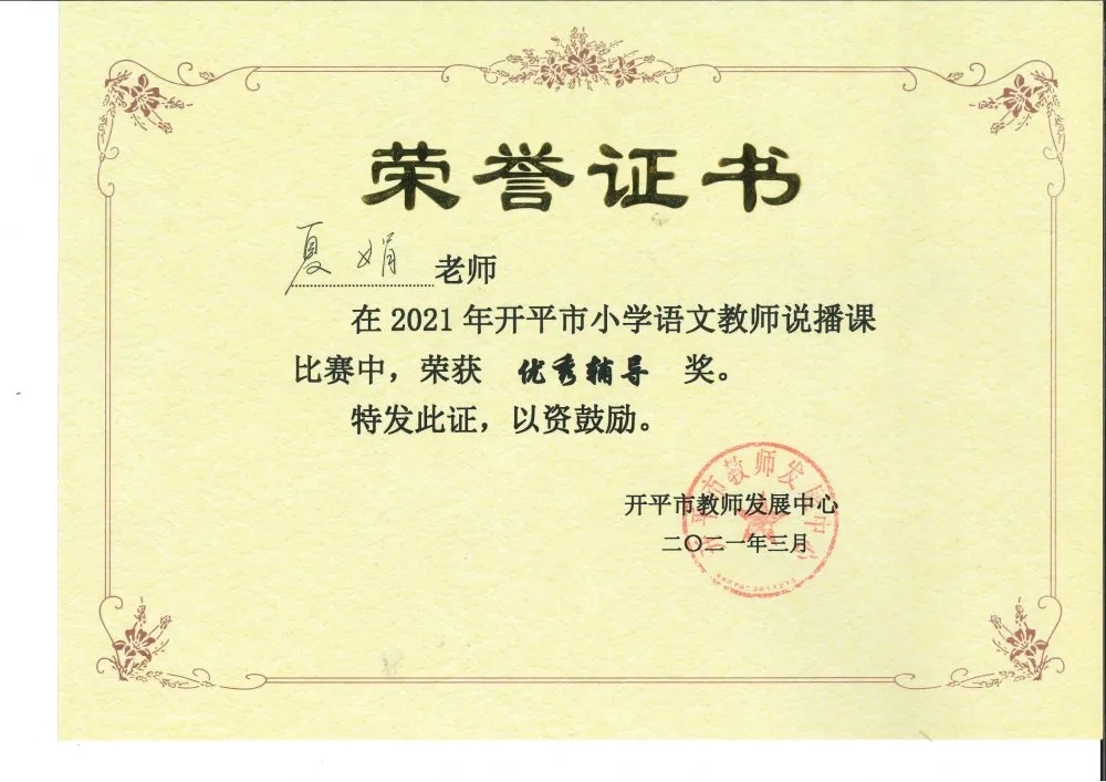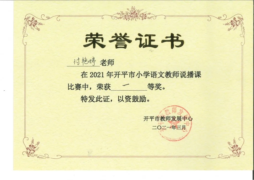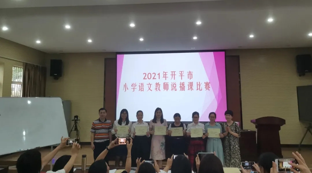 为全力推进全市中小学课堂改革,及时总结交流课堂改革成果与经验,江门市举办了2021年春季小学语文说播课比赛,我市积极参与,赛事正如火如荼地进行着。3月31日,“开平市小学语文教师说播课比赛”决赛在开平市教师发展中心拉开序幕,开碧教师付艳婷代表学校出赛,与来自区、镇的18名选手同台竞技。付老师以其扎实的教学基本功和优秀的专业素养脱颖而出,以总分排名第一的优异成绩,荣获开平市一等奖!付艳婷老师也将代表开平市参加江门市小学语文说播课的决赛。