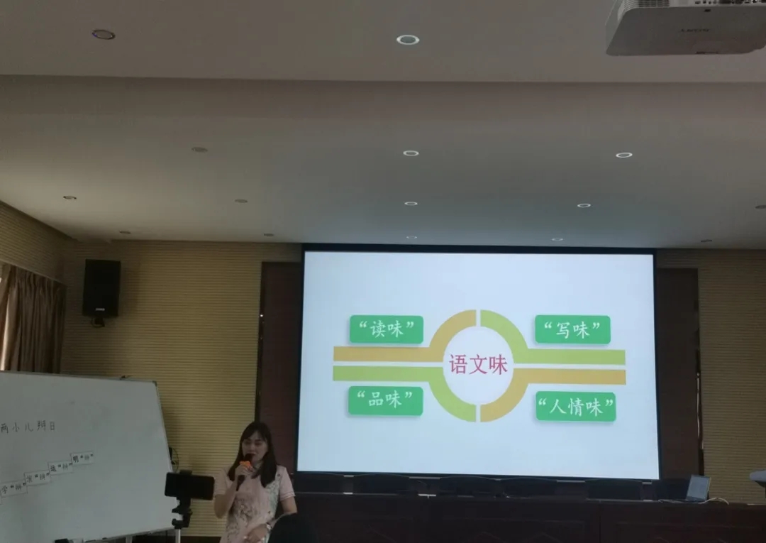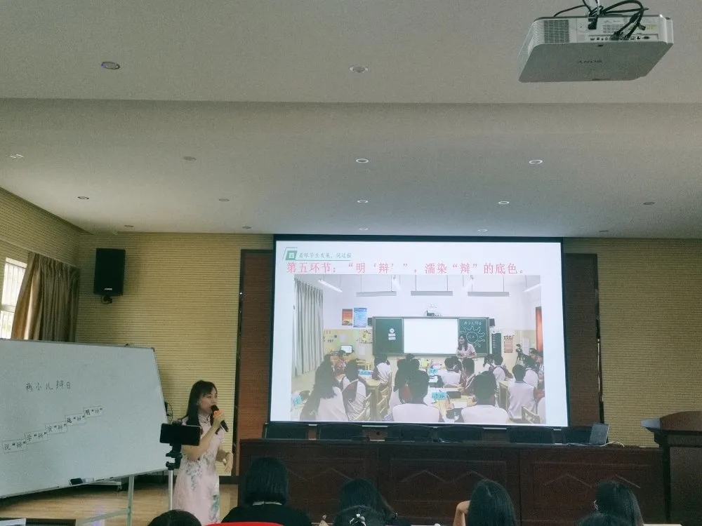 付老师以部编教材六年级下册《两小儿辩日》为题,以“ ‘四味’真火学语文,读写品思提素养”为主题,围绕“紧扣核心素养说理念、根植语文要素说目标、立足课堂教学说策略、着眼学生发展说过程、理清教学思路说板书、回顾整体设计说亮点”六个方面进行阐述,以“辩”字入手,让学生探求“辨”的本意,把握“辨”的思路、享受“辨”的趣味、感悟“辨”的精神,濡染“辨”的本色,螺旋式引导学生深入思考、体验、探究、迁移,从而构建深度课堂,提升学生的核心素养。付老师用富有感染力的语言、鲜活生动的教学实录,向开平市各位小学语文教师献上了一节“有宽度、有温度、有深度”的语文说播课。