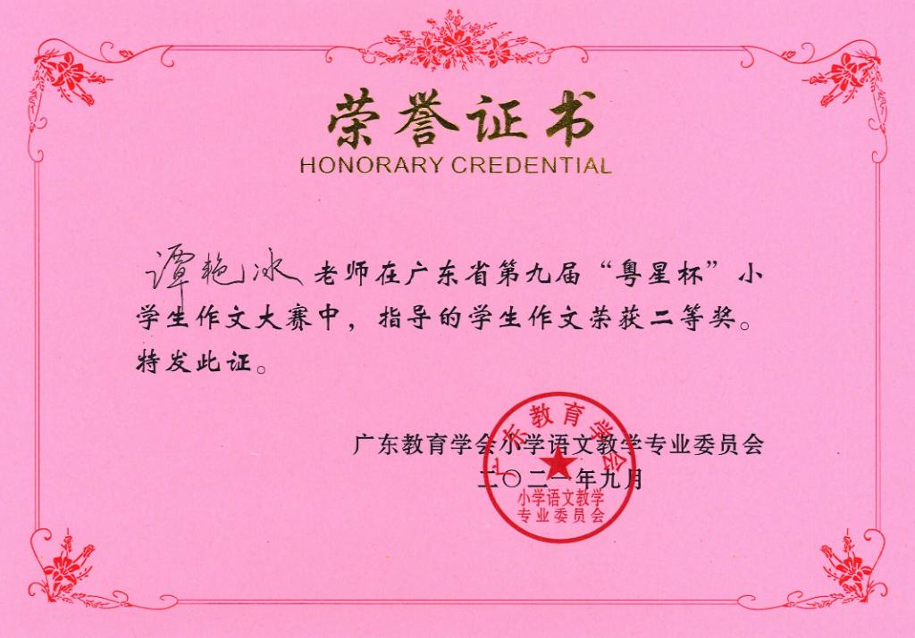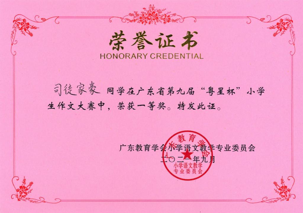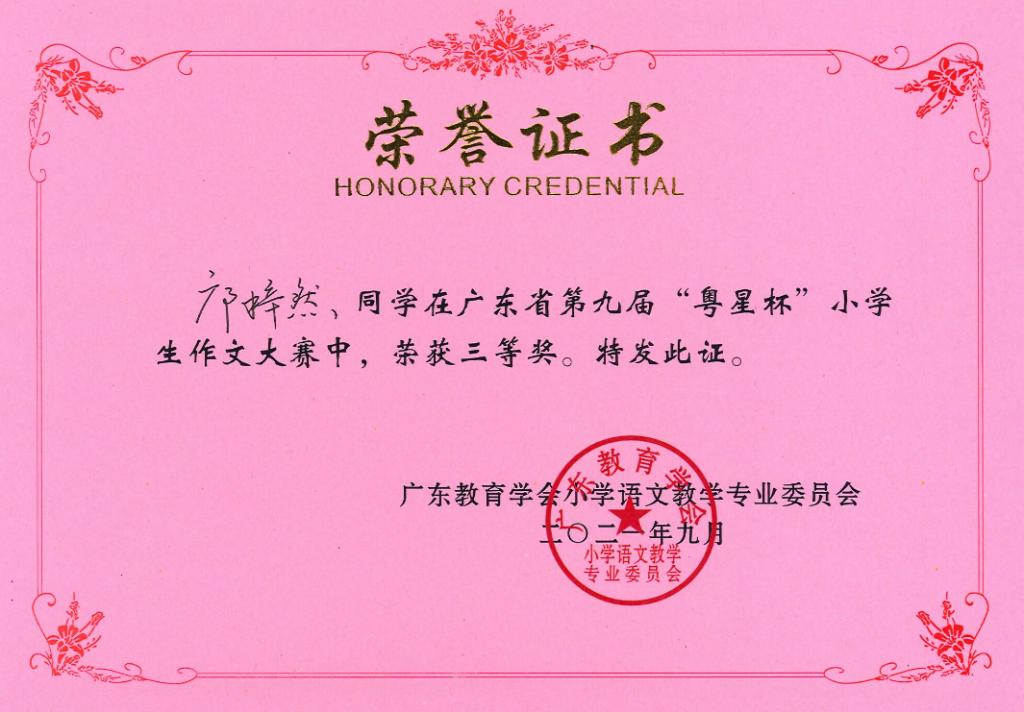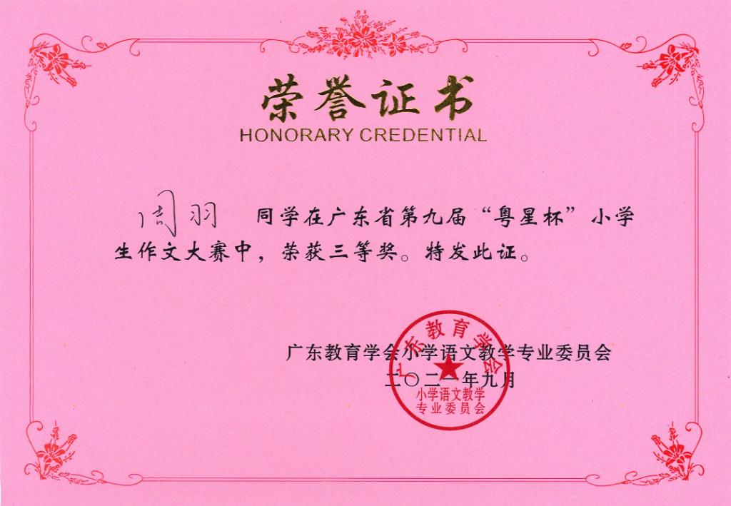 为推进统编小学语文教材的使用,提高小学生的习作能力,鼓励小学生不拘形式地自我表达和与人交流,《广东教学报》小学语文版和广东教育学会小学语文教学专业委员会、广东省小学生文学社联合举办第九届“粤星杯”小学生征文评比活动。我校学子积极投稿,喜获佳绩。