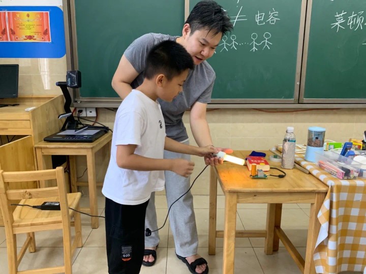 二(4)班 谭玥茵爸爸本节课以制作“莱顿瓶”为起点,充分激发孩子对“电”的好奇与兴趣。玥茵爸爸重视孩子的体验学习,带来“千人震”实验,让孩子们感受微弱的电流从手上穿过,带来一阵麻麻的感觉。小型“特斯拉线圈”放电实验,创造出隔空点亮了荧光灯泡的神奇。孩子们在这节课中感受到学习物理的乐趣,激起学习物理的兴趣。主动参与课堂,使课堂不断泛起浪花。