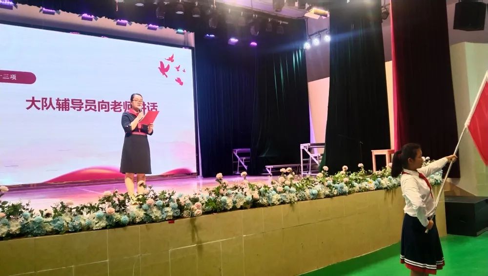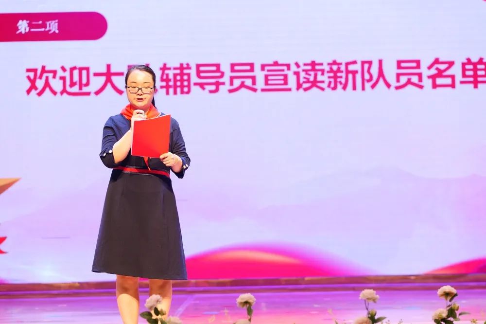大队辅导员向仙老师带领全体少先队员诵读《少年中国说》并呼号,她希望新队员们能够不断学习、不断进步,成为一名优秀的共产主义接班人。