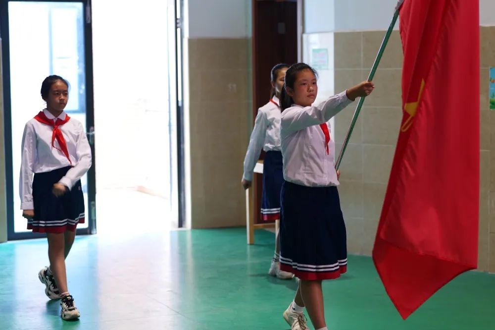 随着激昂的乐曲,护旗手迈着坚定整齐的步伐,在全体少先队员的注视下踏步而来。全体队员敬队礼,出少年先锋队队旗。