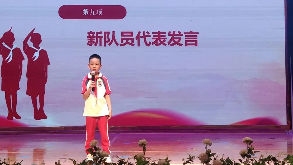 一(3)的新队员代表伦君鸣同学表示,用实际行动争做新时代光荣的少先队员,用自己的行动让红领巾更红,让队旗更亮。
