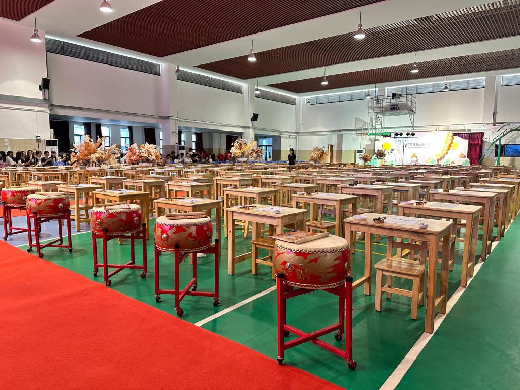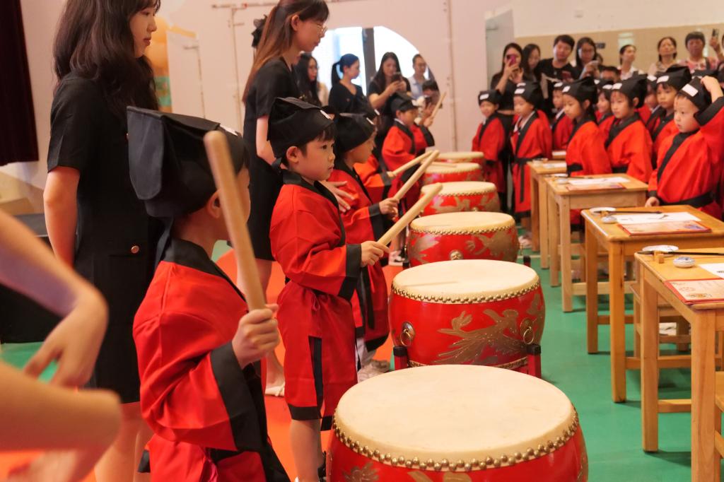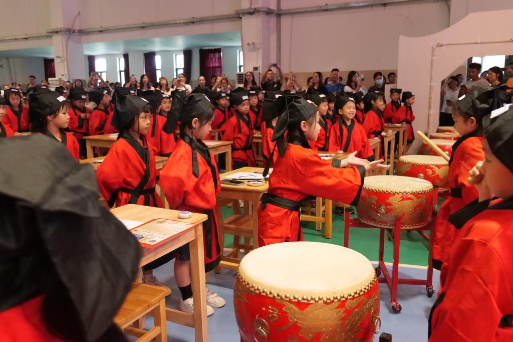 击鼓三声,明志立誓。一击鼓,同学们跟读:尊敬师长。二击鼓:热爱学习。三击鼓:为校争光。孩子们面对家长勇敢说出自己的志向,现场的声音稚嫩却有力。