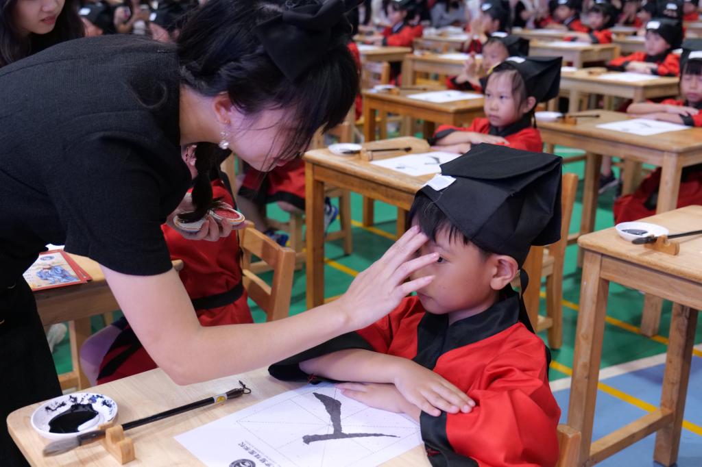 在古代,学童入学时,都会有启蒙老师用红色的朱砂在学子的额头正中点上一颗暗红色的朱砂痣,痣”通“智”,寓意开启智慧。老师们为一年级新生们在额头正中间点上红痣,希望同学们从此心明眼亮,发奋图强。
