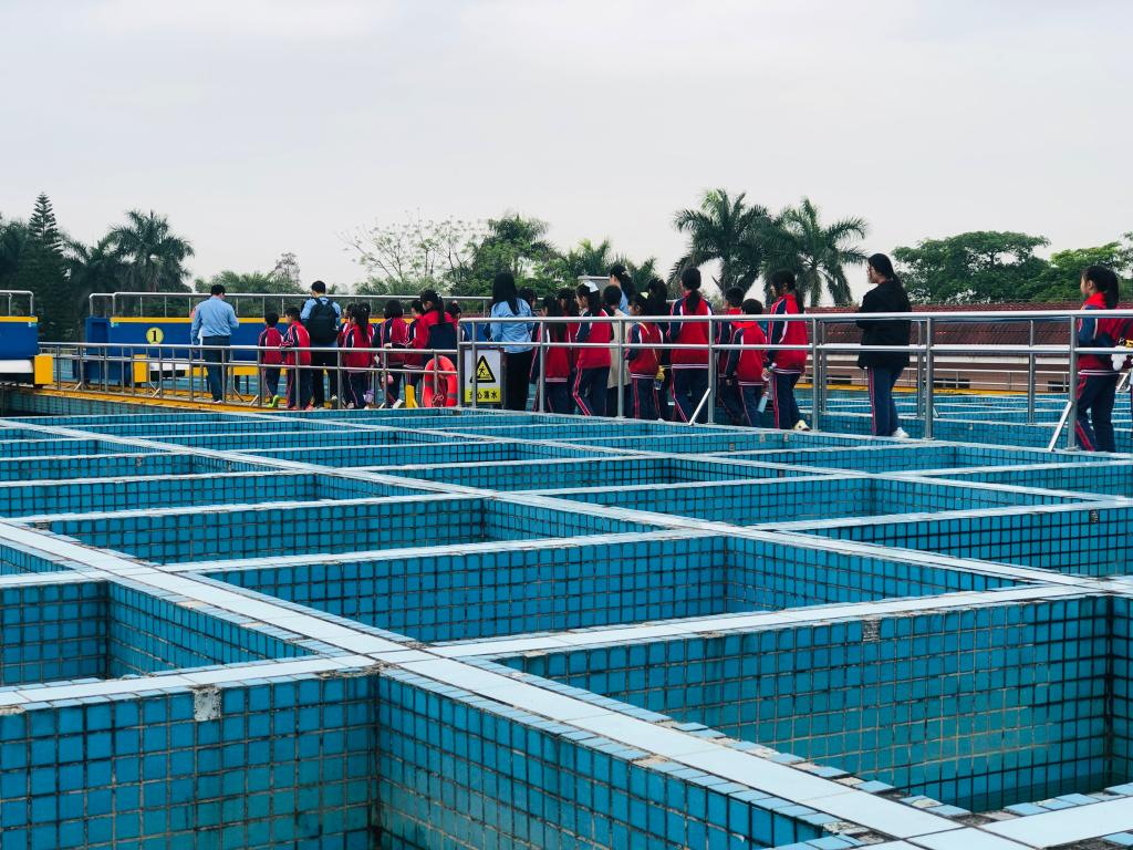 从调度中心出来,同学们近距离感受制水的一系列过程,如:沉淀池,平流沉淀池一共4座,分成进水区、沉淀区、积泥区和出水区四个部分,每个池的水呈现颜色都不一样;气浮池也是4座,主要分为接触区和分离区,将未能沉淀的藻类、矾花等杂质迅速浮至水面,进一步达到澄清的效果;吸水井就更重要了,采用半地下式,为吸水泵提供一个良好的进水状态,真是太神奇了。