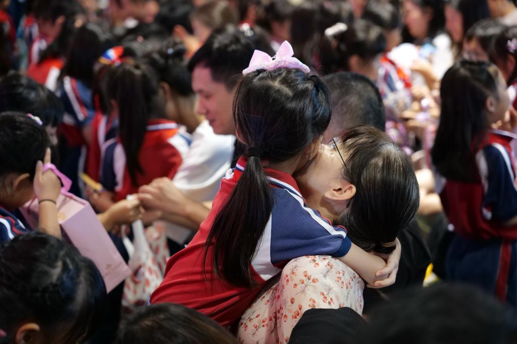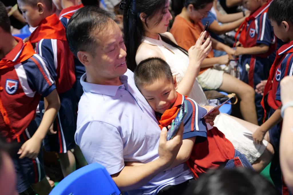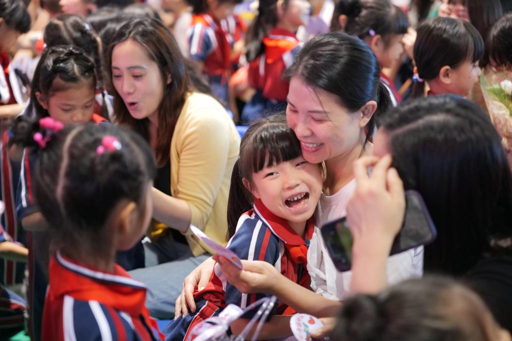 新少先队员们也和家长们进行了礼物互赠,表达自己心中的爱意,亲子拥抱的场面令人感动。
