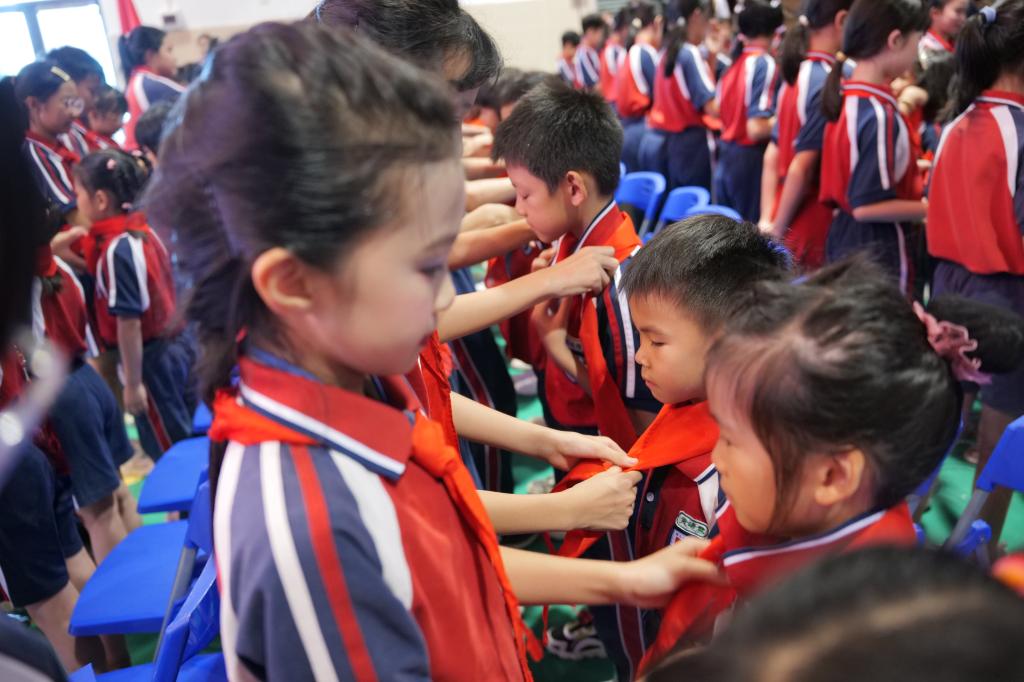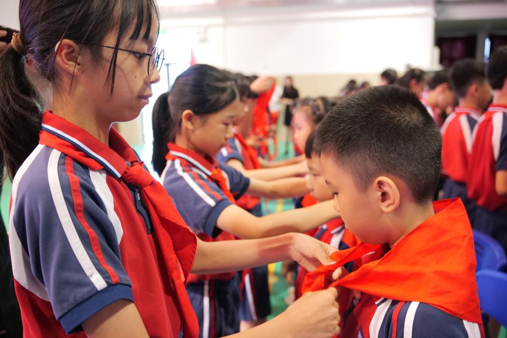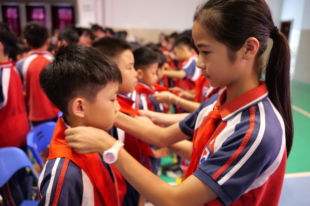 高年级的哥哥姐姐们手捧着象征着光荣使命的红领巾,为每一位新队员佩戴好。新队员们以最标准的敬礼回报了哥哥姐姐们。