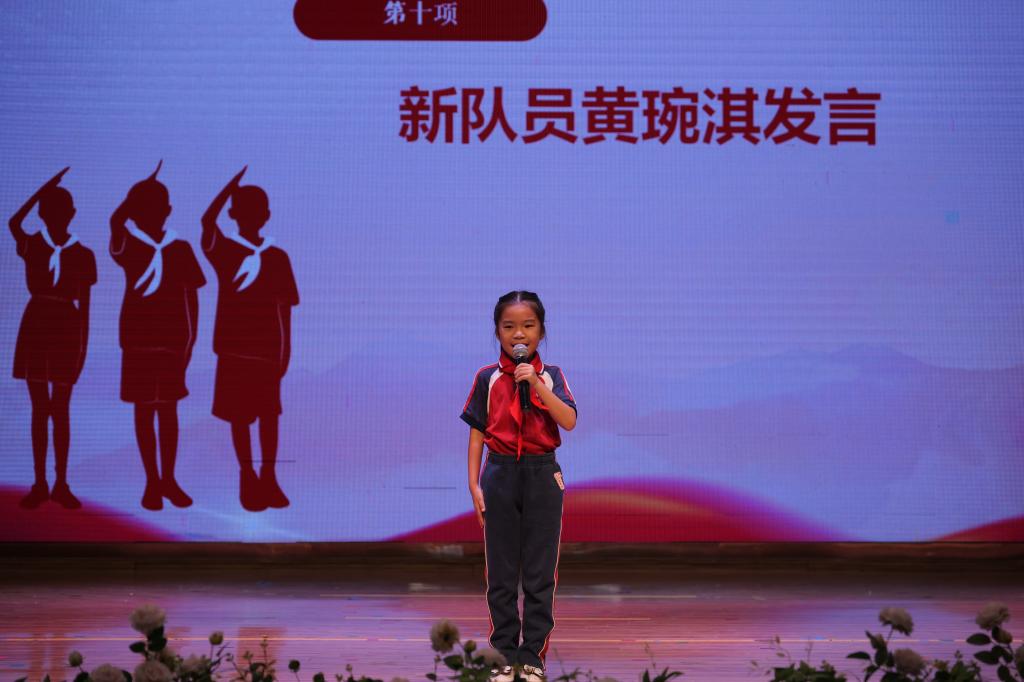 一年级3班黄琬淇作为新少先队员代表进行了发言,她对辛勤栽培的老师们致以衷心的感谢并表示以后一定要以大哥哥姐姐们为榜样,勤奋学习,关心集体,时刻准备着为共产主义事业而奋斗。
