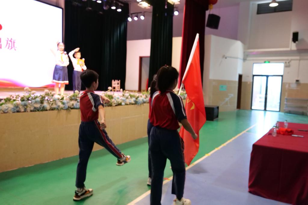 随着激昂的《中国少年先锋队队歌》唱起,少先队旗手迈着整齐有力的步伐护送队旗进入舞台,新少先队员入队仪式拉开了帷幕。