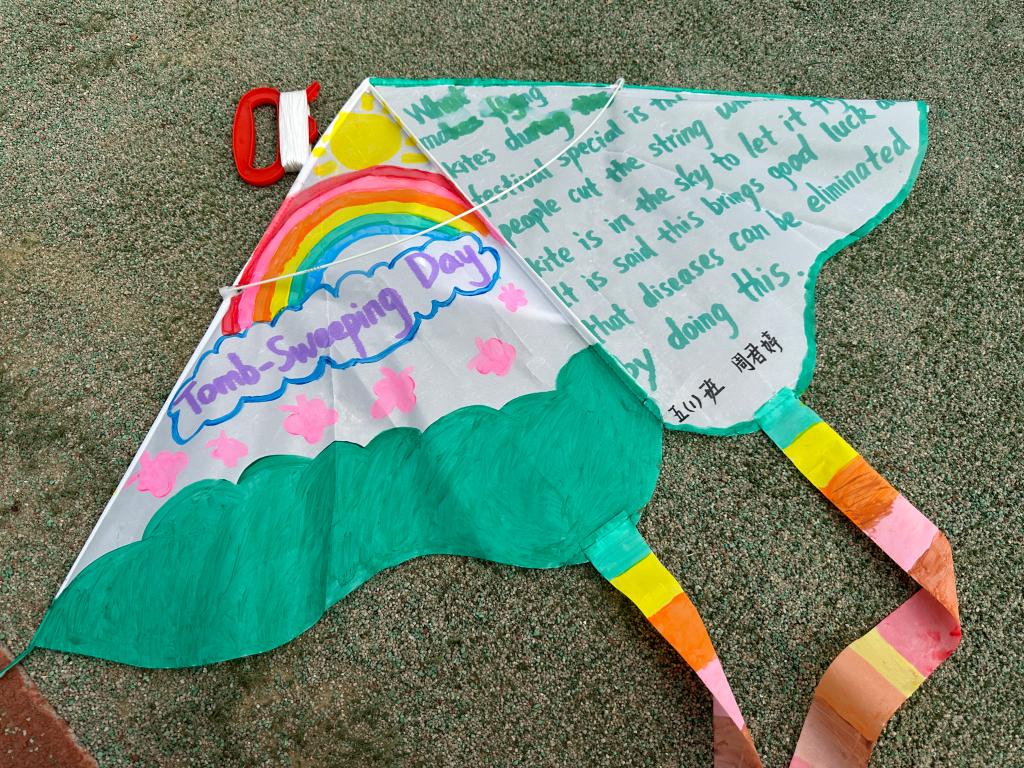 开碧学子作为中国传统文化的宣传大使,我们要更深刻地了解中国传统文化。此次活动,学生了解如何用英语介绍清明节这一中国传统节日,清明节前后,人们会扫墓、吃青团、放风筝等。学生们用英语、绘画等结合设计了自己风筝,并将风筝放飞,放走霉运,收获好运。祝福所有的开碧师生好运连连,幸福美满。