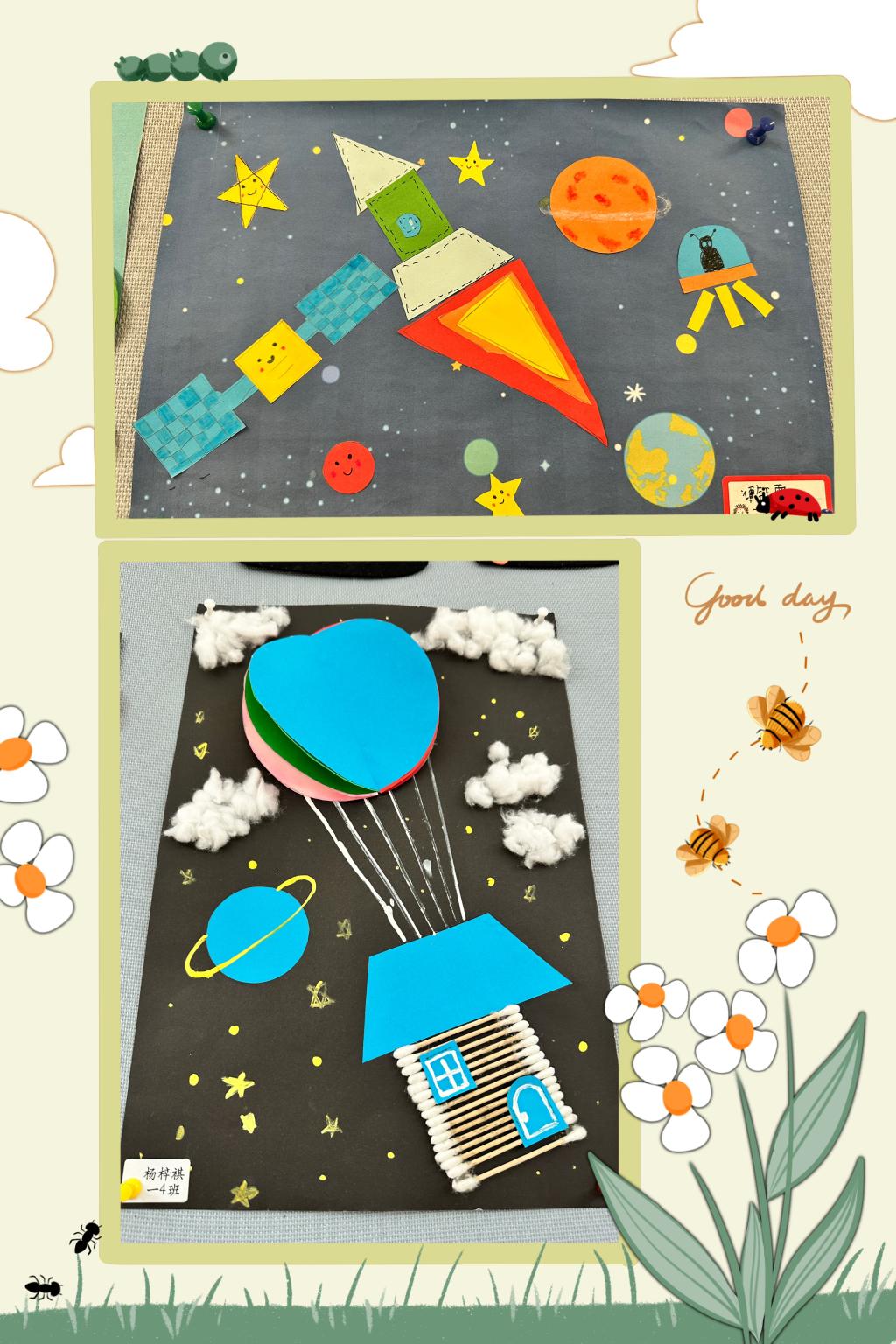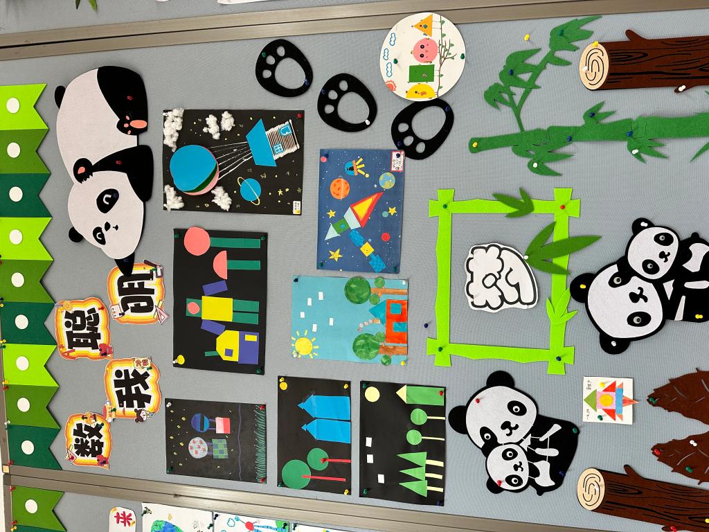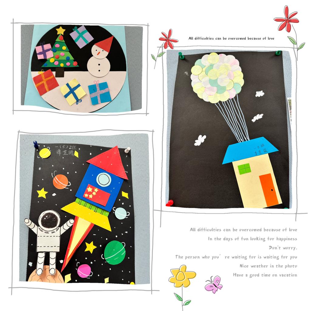 一年级的小朋友想象力丰富,将数学与艺术相融合,在拼贴的过程中体会图形的特征,感受图形的魅力。小小的图形在同学们的制作下变成了企鹅、房子、小花、树、火箭……一幅幅精美的拼贴画跃然纸上,不得不被孩子们的奇思妙想所折服。学生们在创作中真切感受图形的美,更深切体会到数学带来的乐趣。