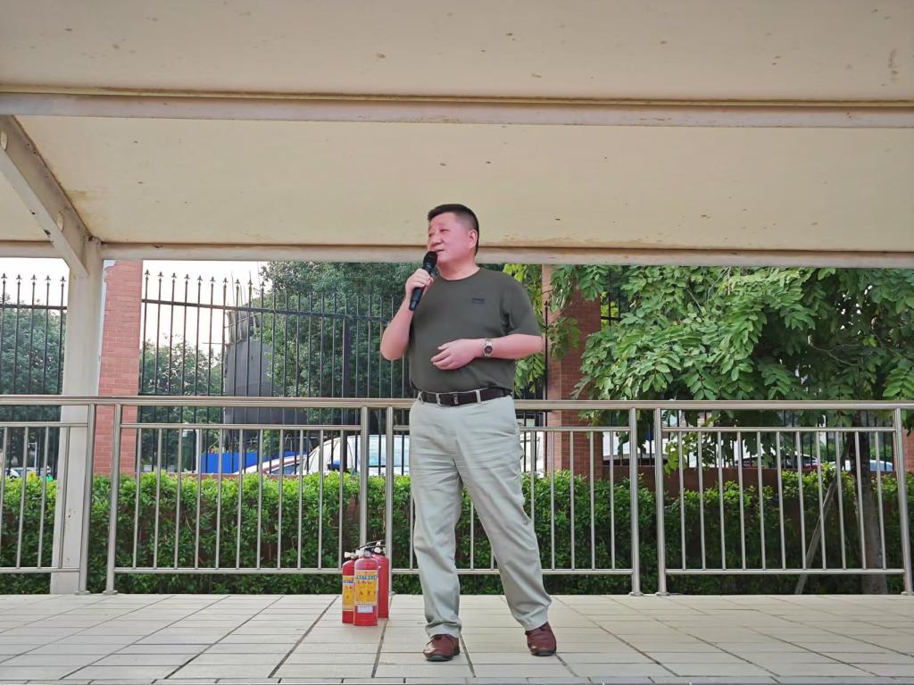 紧接着学生以宿舍为单位再次进行火灾应急疏散演练,由于宿舍楼楼层较高的特殊性,逃生过程中老师们不断提醒孩子们不要拥挤、注意安全,全体师生在3分16秒的时间后安全抵达操场。随后,消防警官给全体师生详细讲解了灭火器的使用方法,提醒大家在使用灭火器的时候要保持冷静,牢记“一提、二拔、三握、四压”的动作要领,将喷嘴对准火源根部扫射,并现场进行了灭火演示,同时邀请了部分教师和学生上台体验。