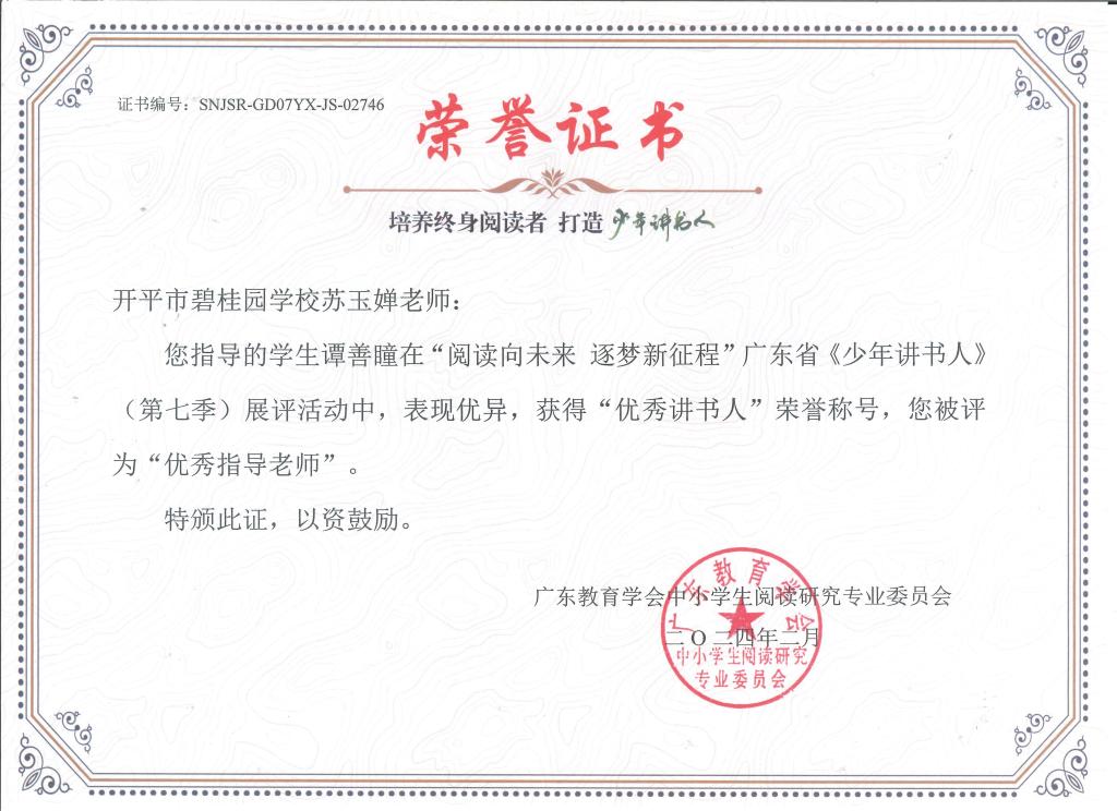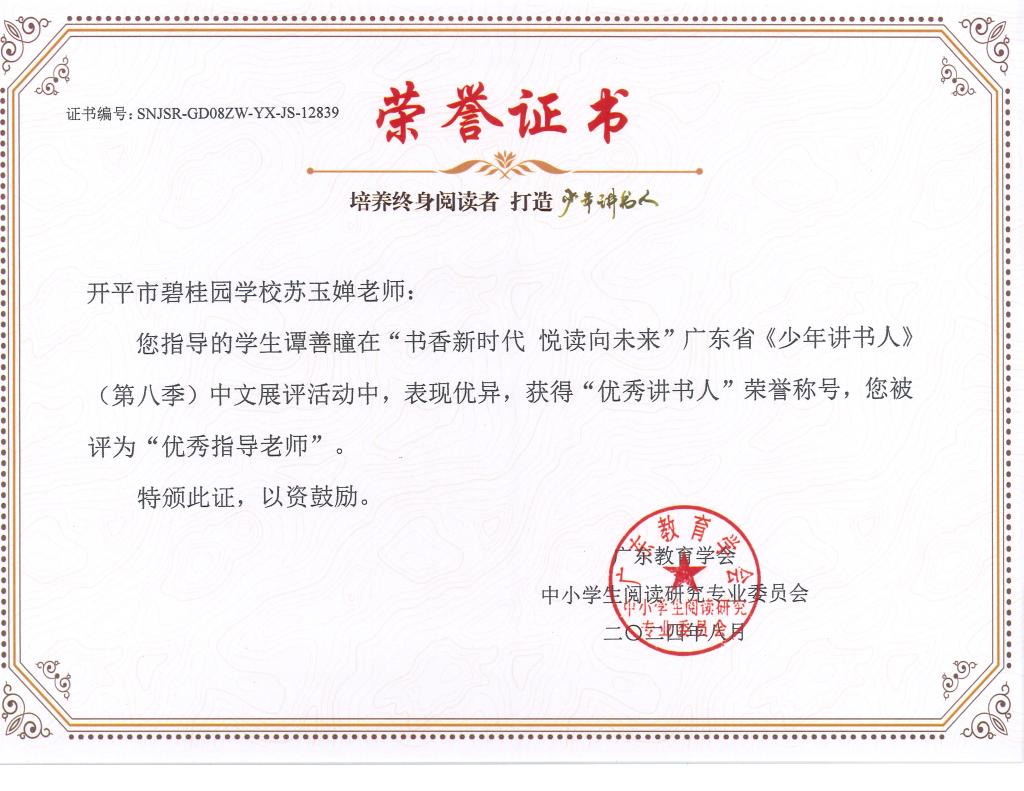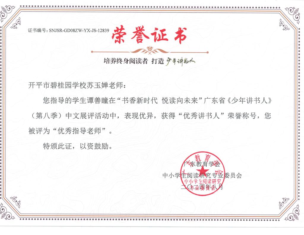 优秀讲书人 谭善瞳 优秀指导老师:苏玉婵