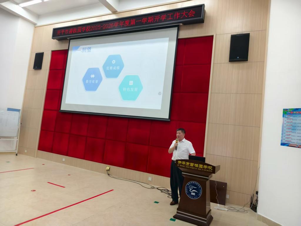 会议上,谭校长以“凝心聚力,赓续辉煌”为主题,回顾了学校在上一阶段取得的各项优异成绩,肯定了所有教职员工的不懈努力。展望新学年,学校聚焦多方面工作:课堂教学上,抓效率、促规范,让学科活动特色化、全面质量化;德育工作借助AI赋能,深化家校共育,重视学生心理健康教育;后勤工作强调纪律与规范,将服务落到实处;打造强劲的教科研团队,以科研助力教学质量的提升。
