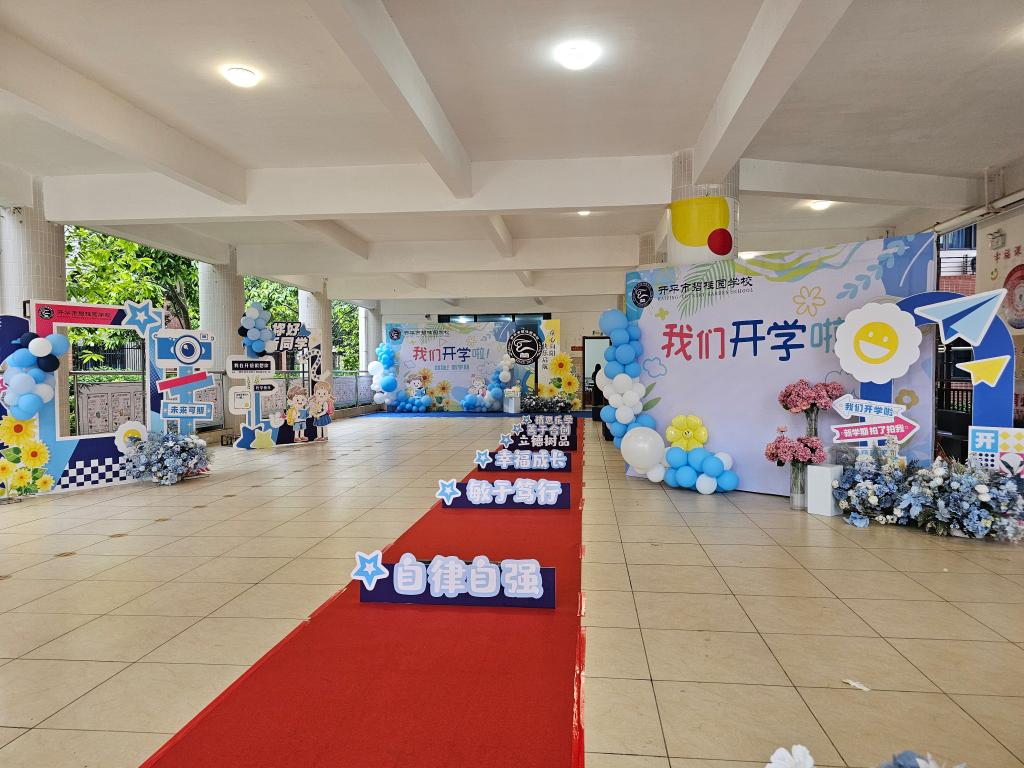 学校一楼大厅精心设置新学期打卡点,学生们留下灿烂笑脸,记录成长瞬间。