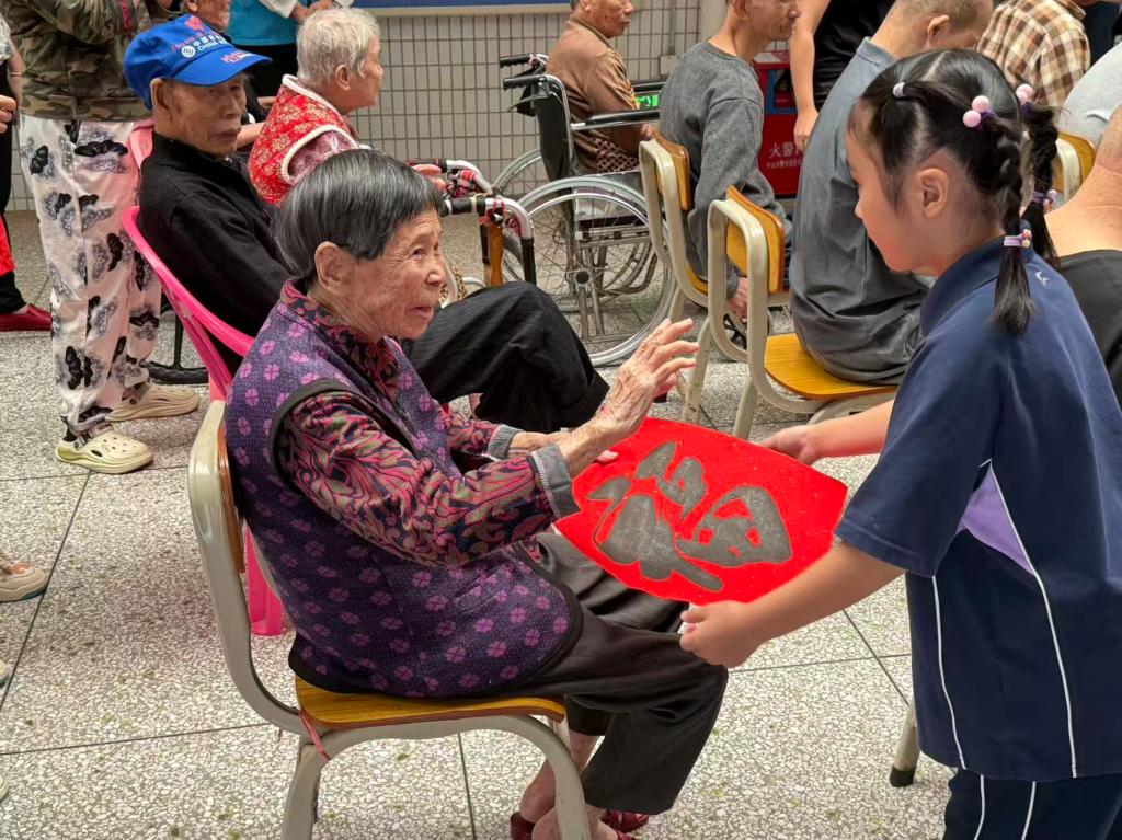 活动现场,最动人的莫过于老少间的温情互动。孩子们稚嫩的声音与老人们慈祥的笑语交织在一起,大家围坐谈心,面对面询问老人们的生活起居与身体状况,轻声叮嘱他们注意添衣保暖、保重身体。师生与家长代表还为老人们送上了牛奶、水果、粮油等生活物资,以及孩子们亲手制作的贺卡——每一笔绘画、每一句祝福,都承载着浓浓的关怀。老人们接过礼物,脸上露出了欣慰的笑容,眼角的皱纹里都盛满了暖意。