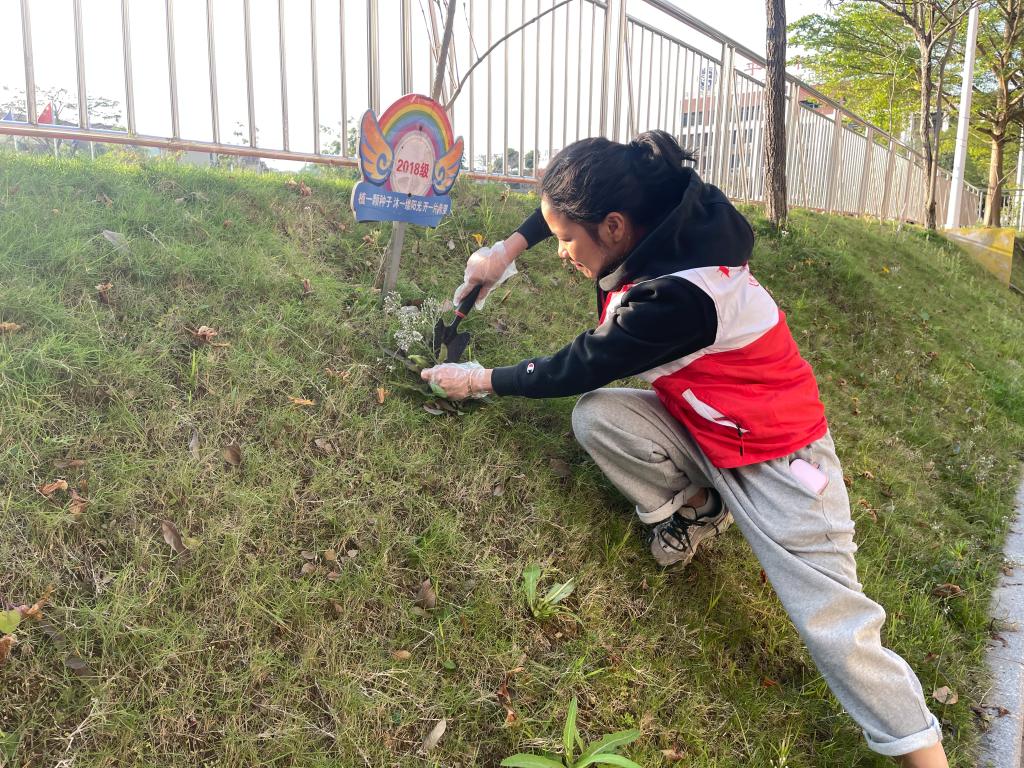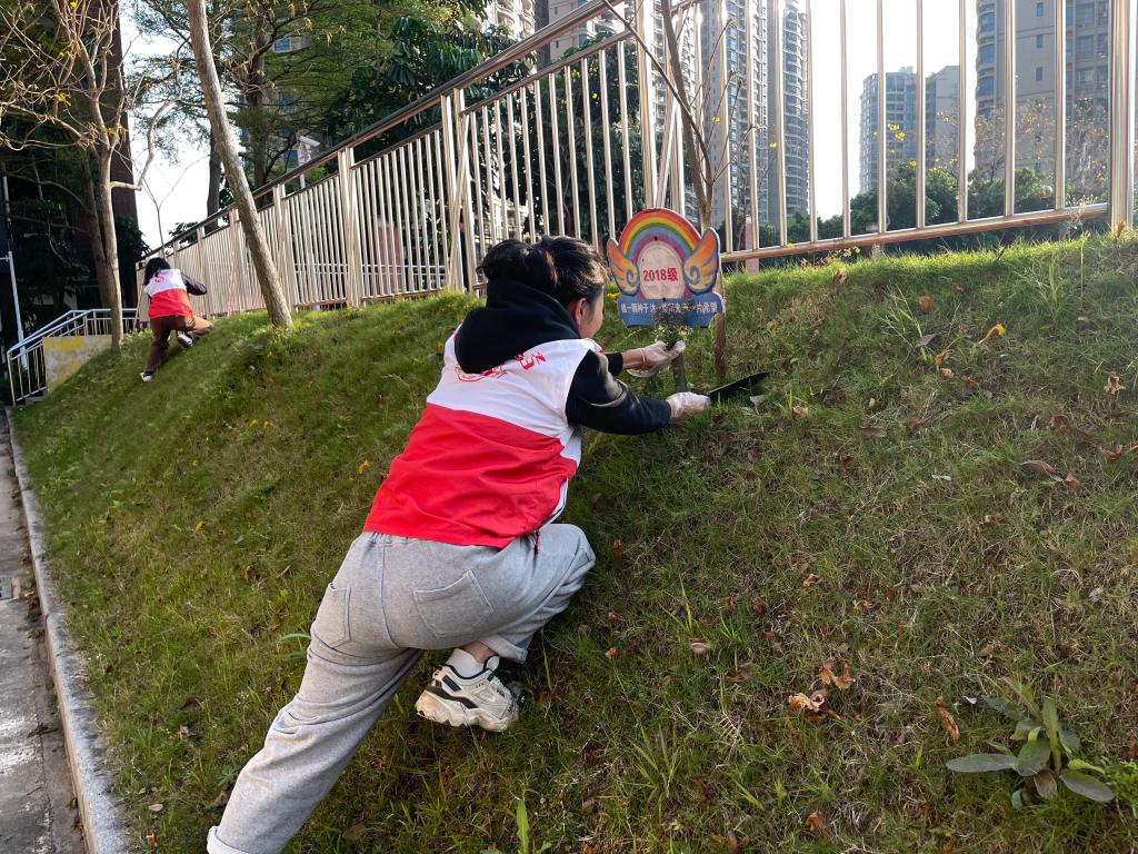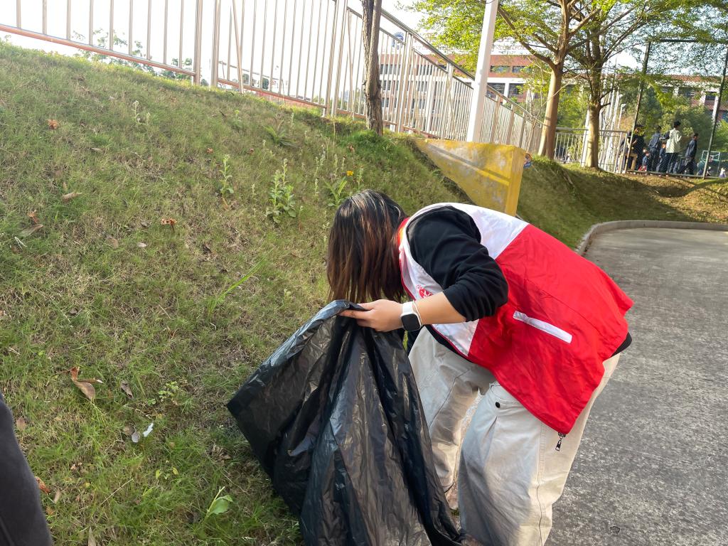 绿化带中,杂草、枯枝与白色垃圾被一一清除。大家不怕脏、不怕累,不放过任何一处卫生死角,用双手擦亮校园环境,让绿意更纯粹、更整洁。
