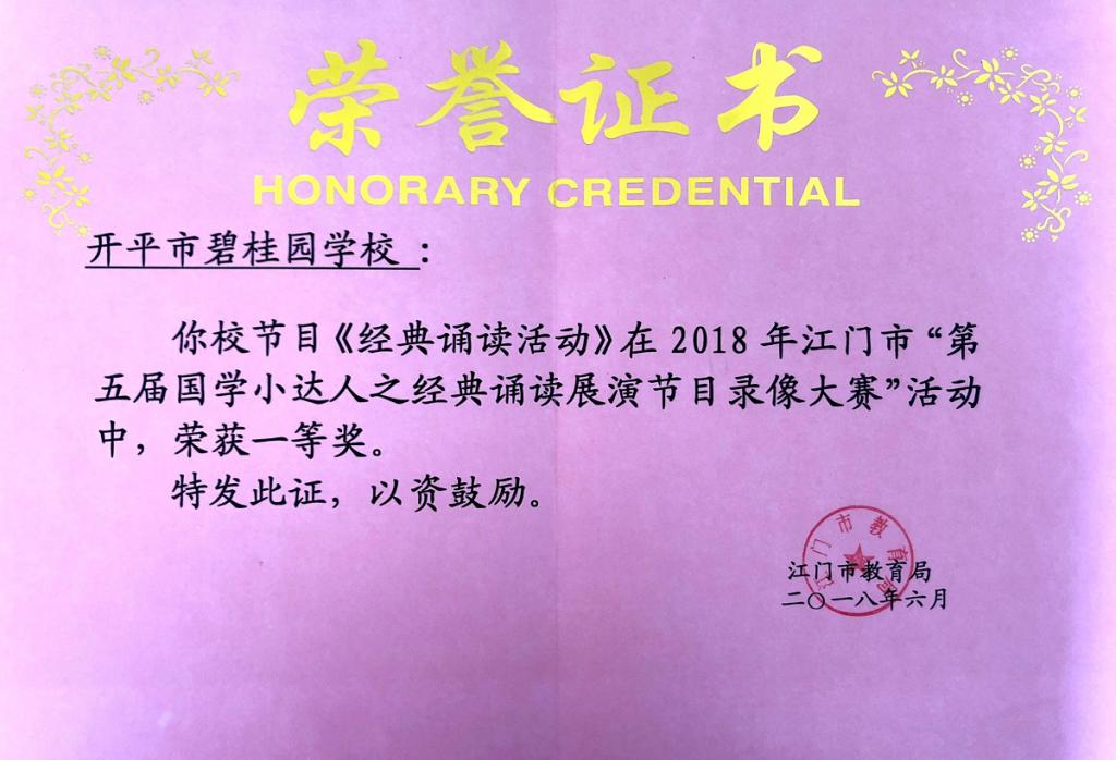 我校节目《经典诵读活动》在2018年江门市“第五届国学小大人之经典诵读展演节目录像大赛”活动中,荣获一等奖