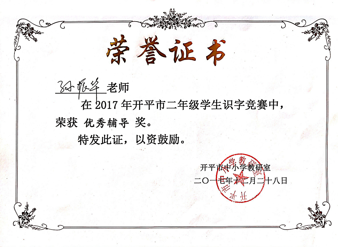 孙振华老师在2017年开平市二年级学生识字竞赛中,荣获优秀辅导奖