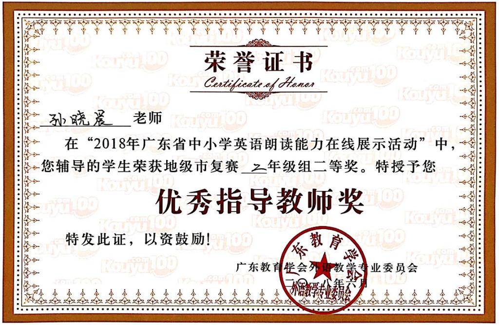 孙晓晨老师在“2018年广东省中小学英语朗读能力在线展示活动”中,辅导的学生荣获地级市复赛二年级组一等奖,授予您优秀指导教师奖