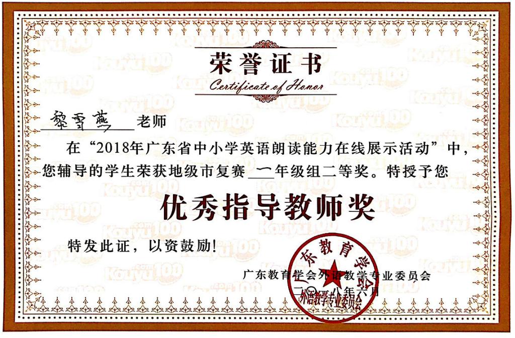 黎雪燕老师在“2018年广东省中小学英语朗读能力在线展示活动”中,辅导的学生荣获地级市复赛一年级组一等奖,授予您优秀指导教师奖