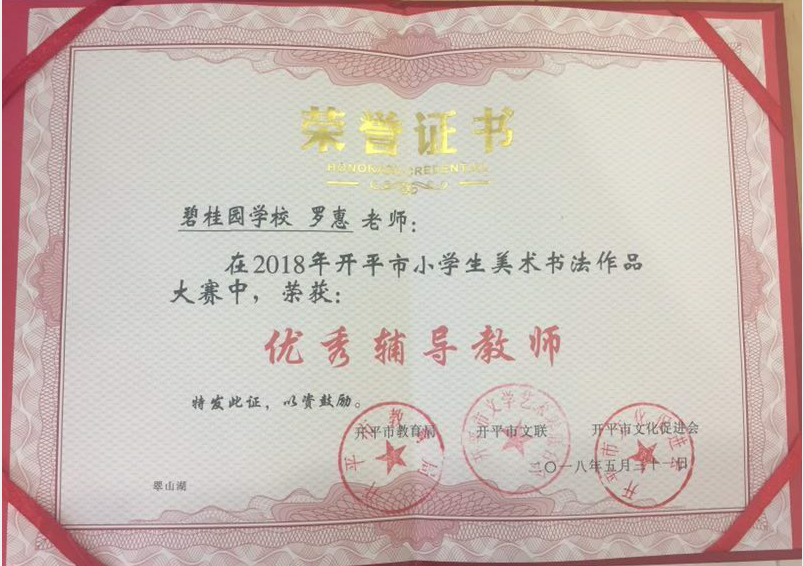 罗惠老师在2018年开平市小学生美术书法作品大赛中,荣获“优秀辅导教师”称号
