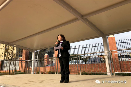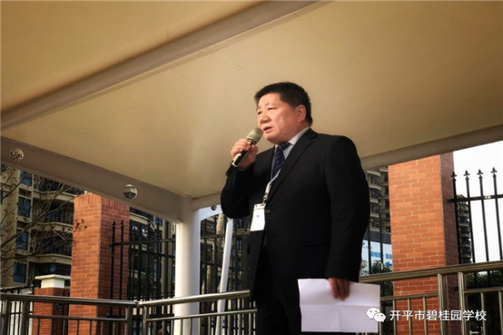 尊敬的谭家文校长向全体师生致辞。谭校长代表全校师生热烈欢迎50多名新生和3名新老师加入开平市碧桂园学校这个幸福的大家庭,他回顾了上学期我校师生所取得的优异成绩,特别是我校四年级学生,在开平市期末统考中各科成绩名列前茅,语文单科平均分在全市70所学校中位居第一,优秀率排名第二,我校三科总分平均分超过市平均分22.3分,总分优秀率70.59%,全市排名第一,为开平市碧桂园学校打响了第一炮。他希望开碧学子在新的学期里再接再厉,再创辉煌!